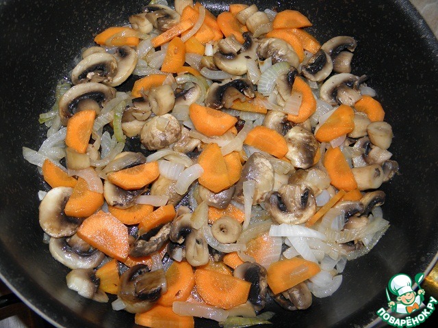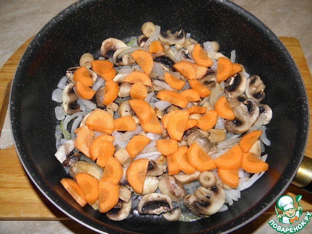 Режем морковь шайбочками, не мельчим) добавляем ее к луку с грибами