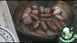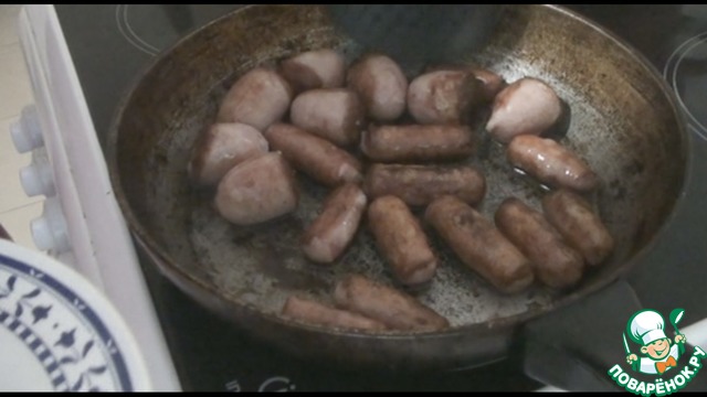 Колбаски нарезаем средними кусочками и обжариваем на небольшом количестве подсолнечного масла до готовности. Перекладываем их на тарелку и отложим пока в сторону.