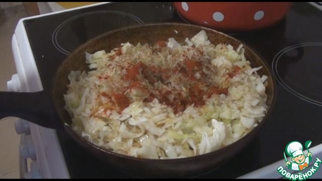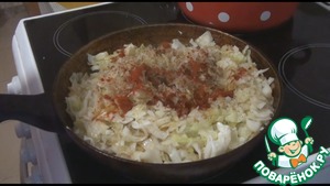 На этом же масле обжариваем нарезанную луковицу, потом добавляем к ней нашинкованную капусту. Если нужно, добавим еще немного подсолнечного масла. Посолим по вкусу, поперчим, добавим специи любимые, я добавила чайную ложку паприки, накрываем крышкой и тушим до готовности.