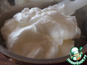 Яйца разделить на белки и желтки. Белки взбить со щепоткой соли до тугих пиков.