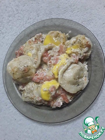 Заливаем пельмени сметанно-овощной заливкой, ставим в разогретую духовку 180-200*С минут на 25-35 (зависит от вашей духовки и объема блюда)