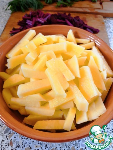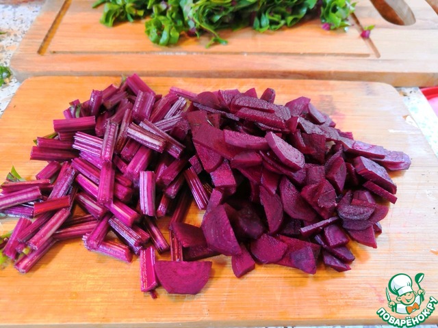 Свеколки почистить и порезать тонкими пластинками. Стебли отделить от ботвы и порезать на брусочки.