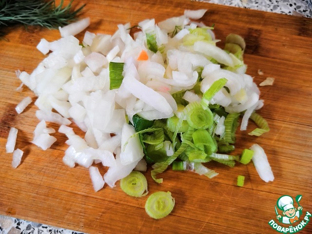 Также положить порезанную зелень укропа и зелёный лук (этот шаг можно пропустить и добавить в уже готовый суп при подаче - кто как больше любит).