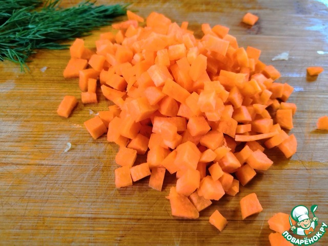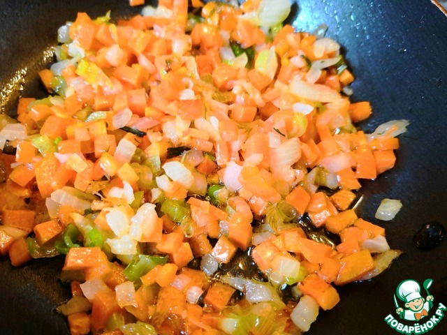 Морковь добавить к луку и еще немного обжарить до золотистого цвета.