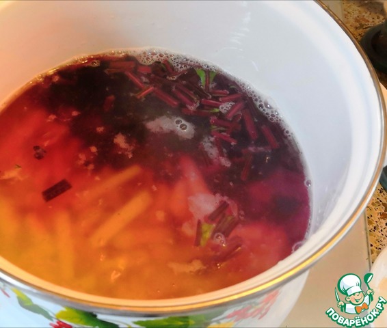 Как только закипит - добавить свеклу со стебельками. Сейчас буду писать точное время сколько я варю после закипания, чтобы все овощи в супе равномерно приготовились. Многие это уже делают на глаз, но подруга просила ей сказать точно в минутах, может кому тоже пригодится))