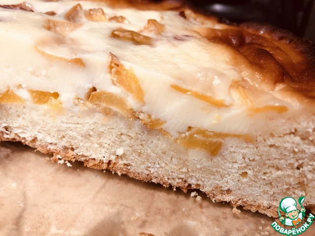 Ставим в духовку. Рекомендуется выпекать примерно 25 минут. Но ориентироваться лучше на свою духовку. Я выпекала 35 минут. За это время крем должен загустеть, бортики пирога подрумяниться. Слегка может подрумяниться и верх пирога, но только слегка. -