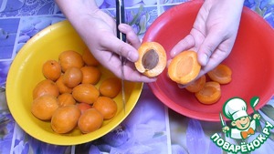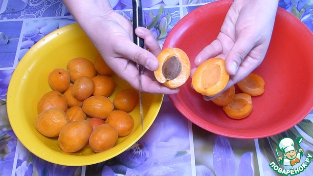 • Абрикосы промываем, разрезаем пополам и удаляем косточки.