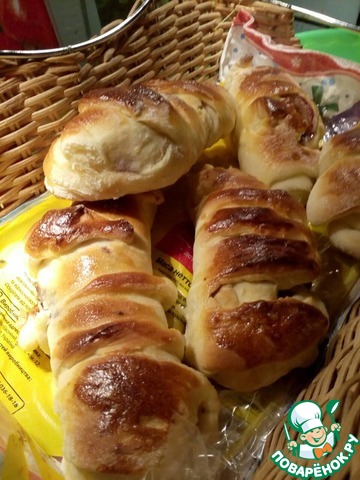 Тесто с начинкой свернуть рулетиком вместе с полосками и перевернуть, чтоб концы полосок были под получившейся булочкой.