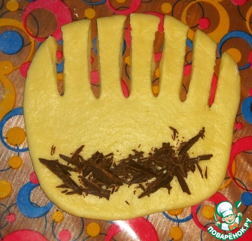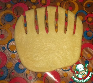 Каждый колобок раскатать в прямоугольник толщиной примерно 3 мм.