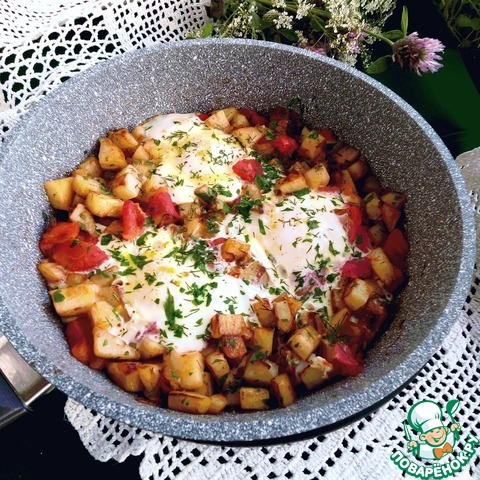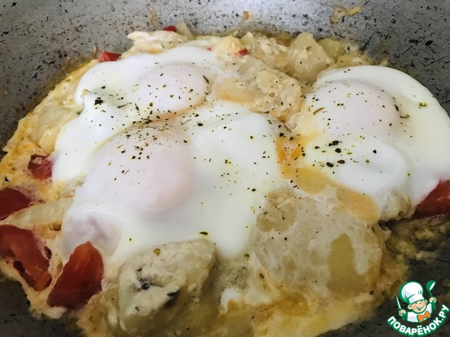 Разбить яйца над овощами, посыпать петрушкой, снова закрыть крышкой и держать до готовности яиц.
