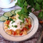 На тарелочку выкладываются овощи с одним яйцом на персону.