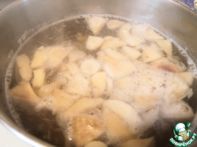 Грибочки почистить, хорошо промыть (стараться не крошить их мелко), порезать на кусочки и залить водой. Посолить.