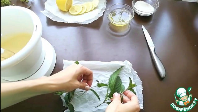 Несколько листиков свежей мяты нарубим и тоже соединяем в миксере.