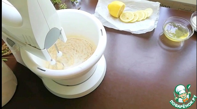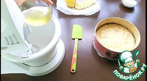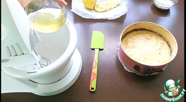 Переводим миксер на низкую скорость и постепенно всыпаем муку, доведя тесто до консистенции густой сметаны. Выкладываем массу в смазанную формочку.