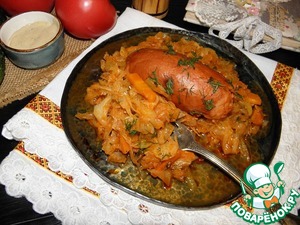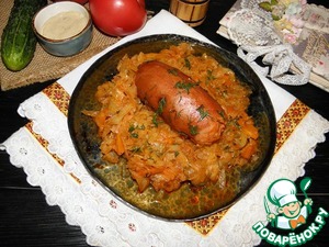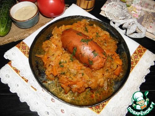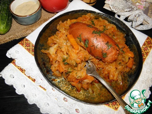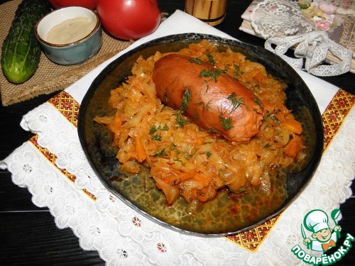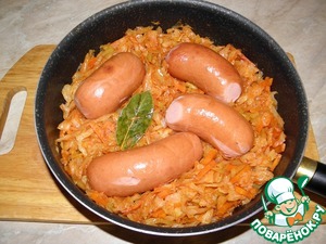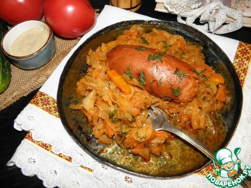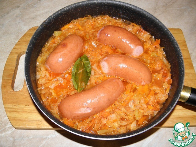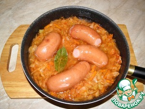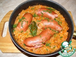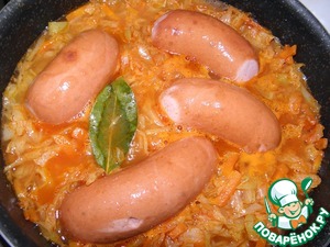 Выкладываем колбаски, ( или сардельки, или шпикачки) немного прижимаем их в капусту.