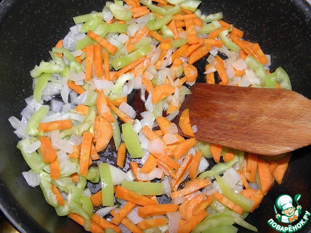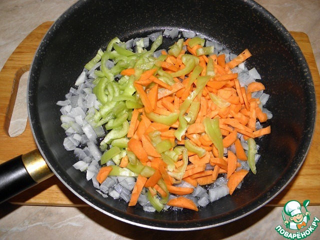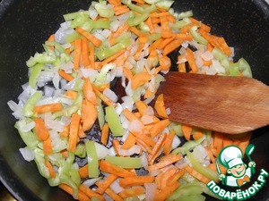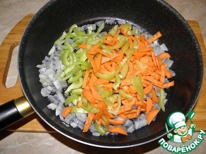 Нарезаем морковь и сладкий перец соломкой - добавляем к луку.