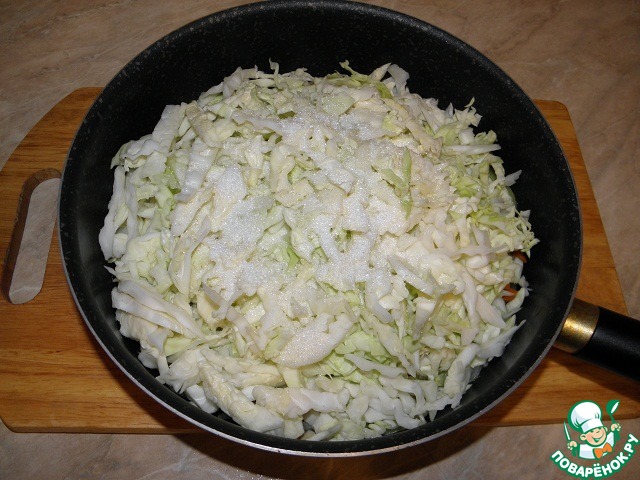 Нарезаем капусту, добавляем к овощам, посыпаем сахаром.