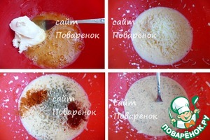 Яйца взбить с солью, добавить сметану, бОльшую часть сыра (немного нужно оставить), орегано, красную паприку (копченую), перец красный жгучий, натереть зубчик чеснока, продолжая взбивать вилкой.