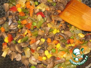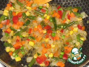 Добавить овощную смесь (у меня была мексиканская), посолить, поперчить и довести до готовности овощей.