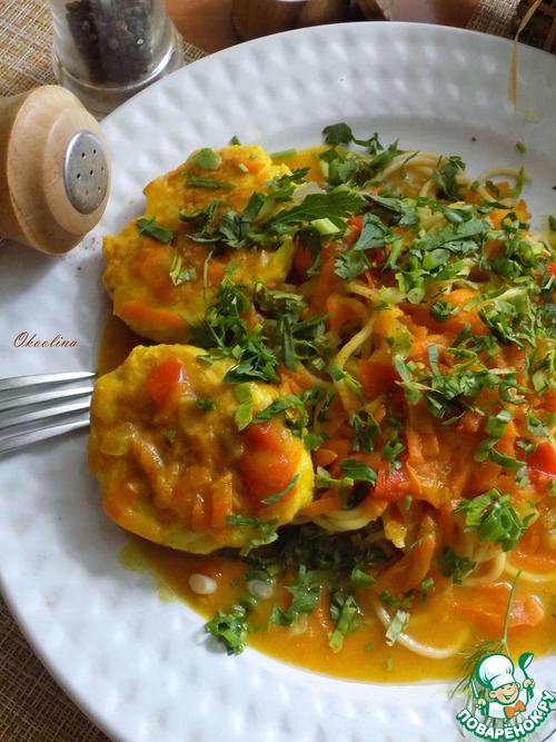 Накрываем стол. Я отварила спагетти. Выложила на тарелку спагетти, котлеты, полила щедро подливой овощной яркой и красивой и присыпала зеленью: укропом, петрушкой и зелёным луком. По желанию можно блюдо поперчить. Я немного поперчила красным жгучим перцем.