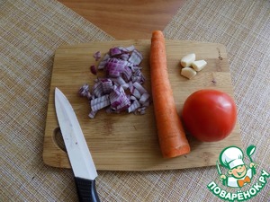 Это набор овощей, который нам понадобится для подливы. Лук мелко режем, чеснок чистим и давим плоской стороной ножа.