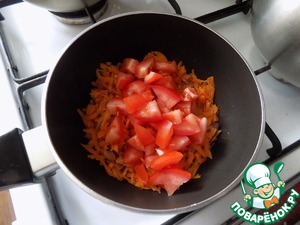 Убираем чеснок и выкладываем морковь, натёртую на тёрке. Перемешиваем, накрываем крышкой, убавляем огонь и томим, пока масло у нас не окрасится в морковный цвет. Это быстро, минуты 2-3. Выкладываем помидор, порезанный мелким кубиком. Опять всё перемешиваем и томим на небольшом огне, пока будем делать заливку для подливы.