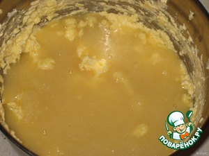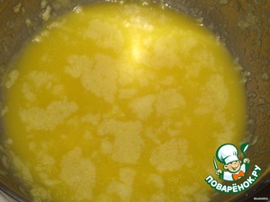 влить 50 г растопленного масла, руками растереть в крошку и убрать ее на время в холодильник. Пока делаем тесто.