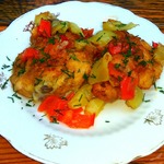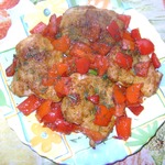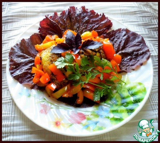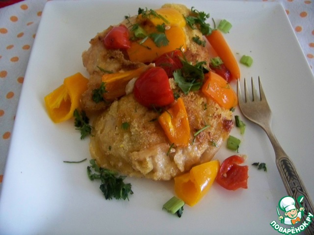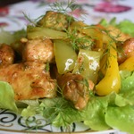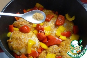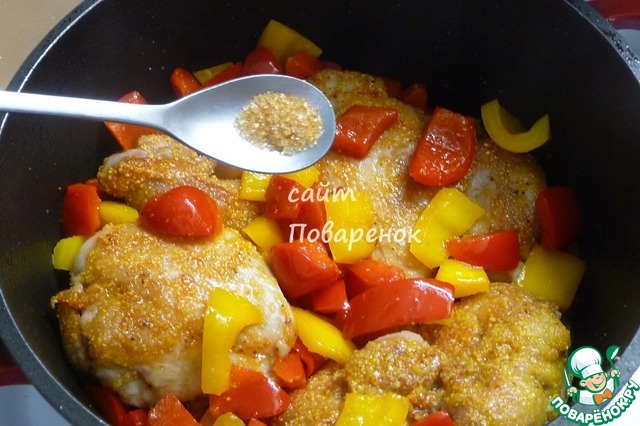 Я обжарила бедра, потом добавила в масло от обжарки бедер сахар и укус. Вернула туда бедра и нарезанный перец. Перемешала и всё это дело поставила в духовку