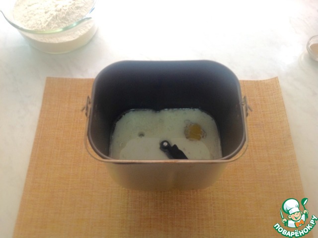 В чашу хлебопечки добавляем молоко, яйцо, подсолнечное масло, сахар, соль и ванилин.