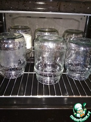 Банки я стерилизую в духовке, перевёрнутые ХОЛОДНЫЕ банки ставлю на решетку, и минут 15 на 150 градусов.