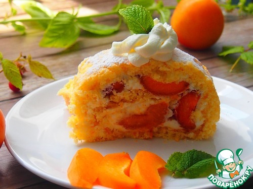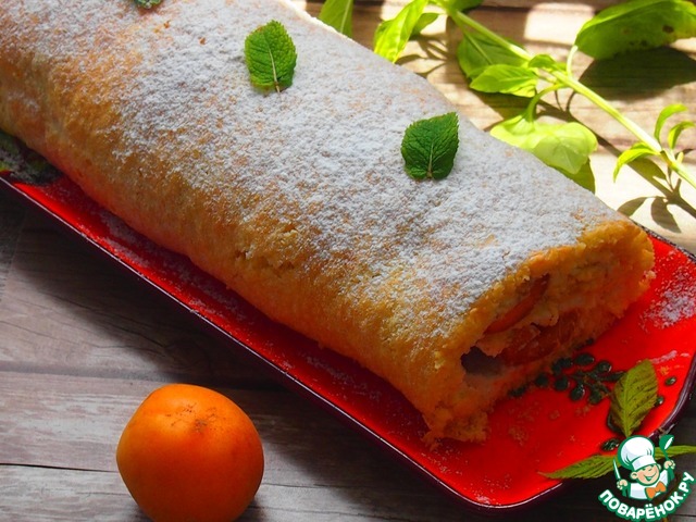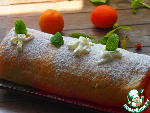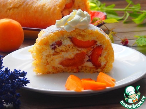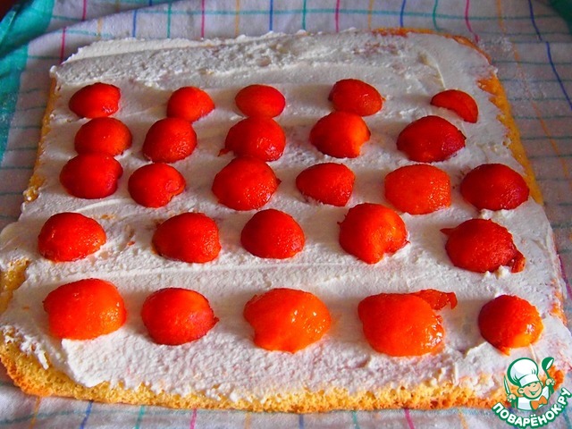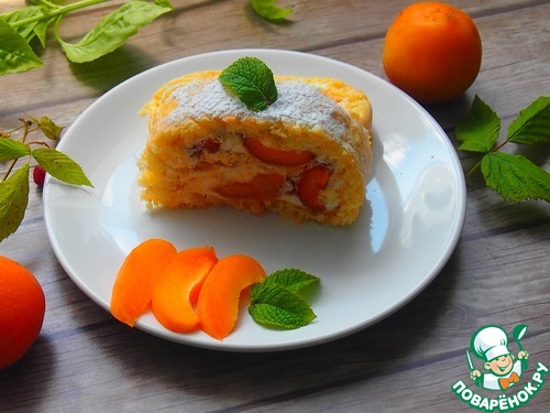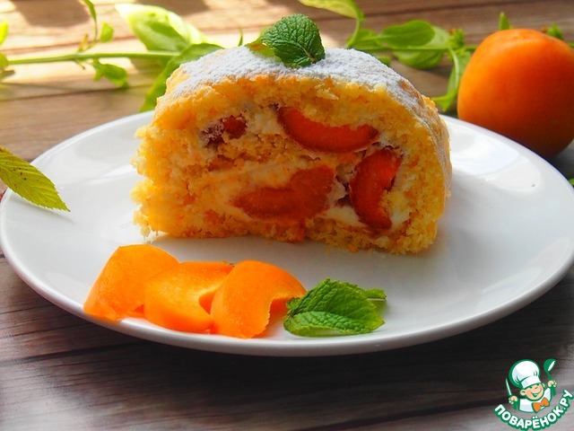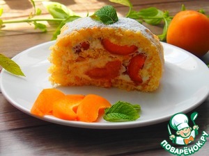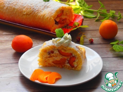 Нанести начинку, разложить половинки абрикосов и с помощью полотенца свернуть рулет. В конце "пути"поставить блюдо, на котором будет находится рулет, и просто закатить на него рулет.