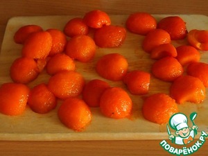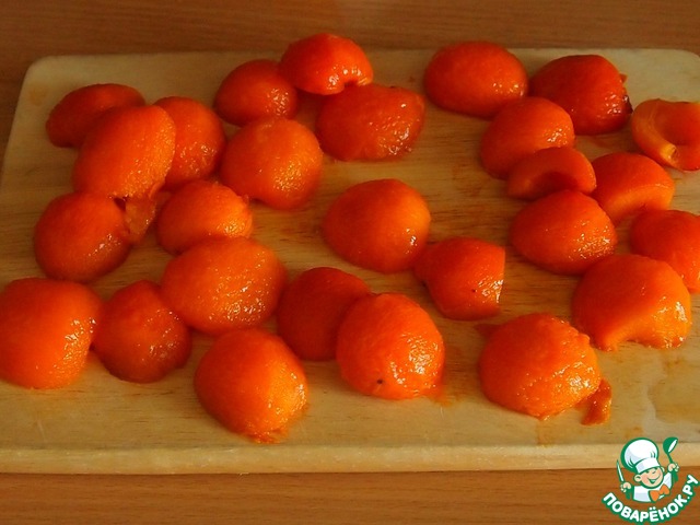 Абрикосы помыть, залить кипятком и почти сразу же горячую воду слить и промыть абрикосы холодной водой. Лучше подойдут некрупные абрикосы.