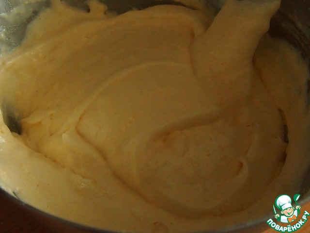 Яйца взбить с сахаром в пышную массу, добавить две ложки горячей воды и еще взбить. Яичная масса должна быть такой консистенции, чтобы след от ложки, например, оставался на поверхности.