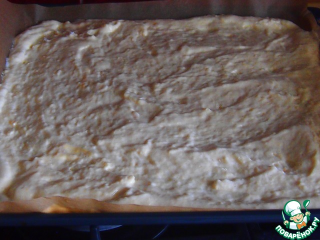 Большой противень (размер моего 35 х 33 см) застелить бумагой для выпечки, вылить тесто и разровнять. Поставить в разогретую до 180 градусов духовку и печь примерно 20 минут.
