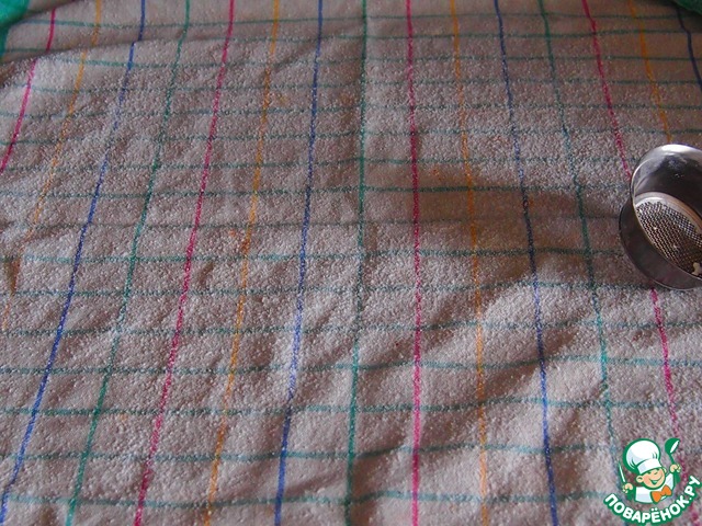 Сухое полотенце расстелить на столе, посыпать его сахарной пудрой.