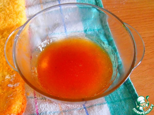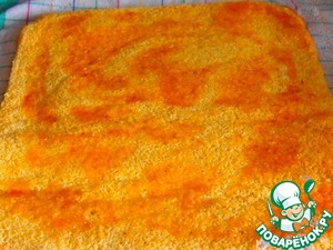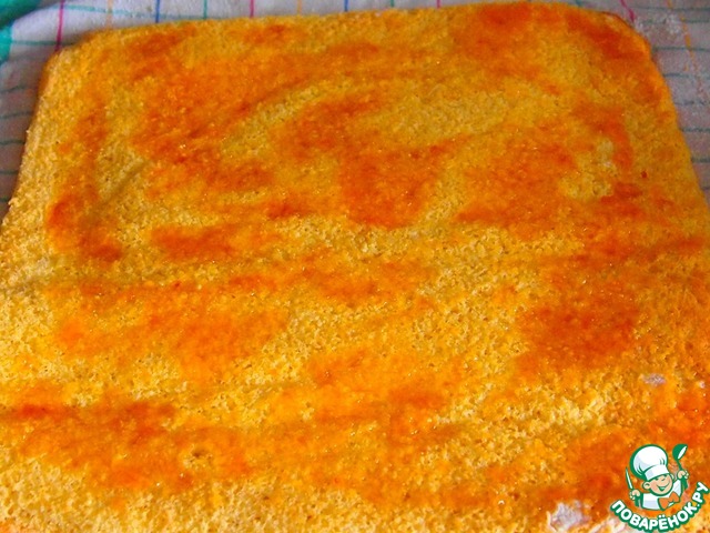 Рулет развернуть. Смазать абрикосовым джемом, чтобы закрыть поры бисквита.
