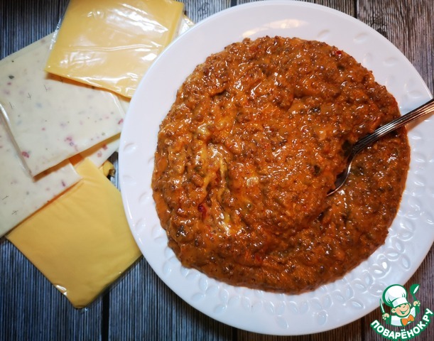 3. Следом добавить 1 упаковку (8 пластин) сыра. Постоянно помешивая дать сыру полностью расплавиться на минимальном огне.