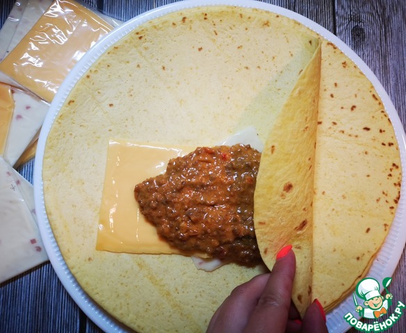 6. Чуть ниже середины лепешки положить 2 кусочка сыра, начинку, и свернуть кулечком. Для этого удобнее всего сначала сделать донышко, подвернув левый край лепешки и придерживая его свернуть от себя наверх. Можно применить любой удобный Вам способ.