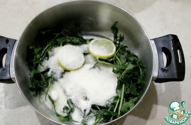 Для консервации в 3-х литровую банку выкладываем веточки мяты, добавляем лимон, сахар и лимонную кислоту.