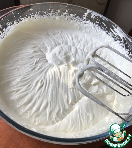Приступаем к приготовлению крема. Перетираем блендером творог до образования однородной массы, добавляем сахарную пудру и взбиваем минут 5. Добавляем охлажденные сливки и взбиваем до загустения ещё 5-7 минут. Долго взбивать не стоит, чтобы масса не стала снова жидкой.