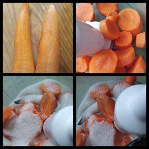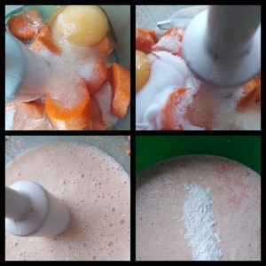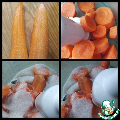 Морковь почистить и помыть, нарезать кружками, поместить в блендер. Добавить сахар и растительное масло.