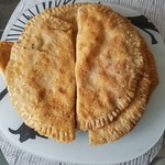 Затем аккуратно, от середины круга, сгоняя пузырьки воздуха к краю раскатанного сочня, накрыть начинку из фарша второй половинкой круга, слегка придавить ладонью таким образом, что бы склеить обе половинки сочня. Края чебурека защипнуть.