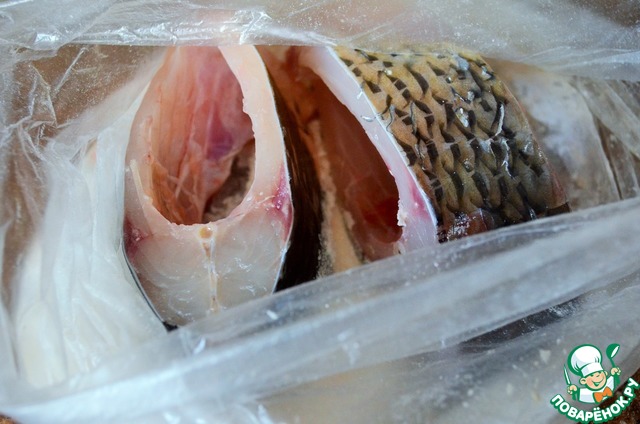 Рыбу почистить, нарезать на стейки, 2,5 - 3 см.,