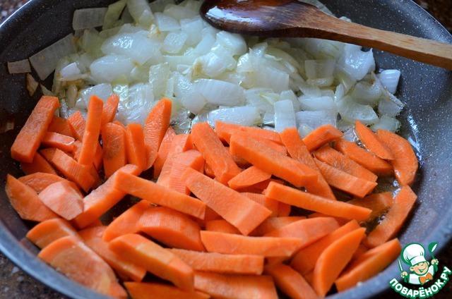 Добавить морковь, жарить 5-7 минут на среднем огне.