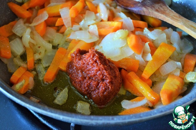 Добавить томатную пасту, сахар, перемешать, тушить 5 минут.