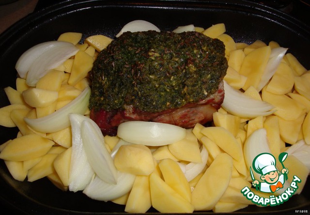 Натереть полученной пастой свинину и оставить на 1 ч при комнатной температуре. Переставить в разогретую до 190 °С духовку. Готовить 1 ч 30 мин.
