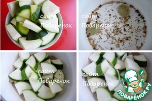 На дно кастрюли положить специи, слоями выложить цуккини,