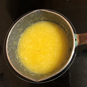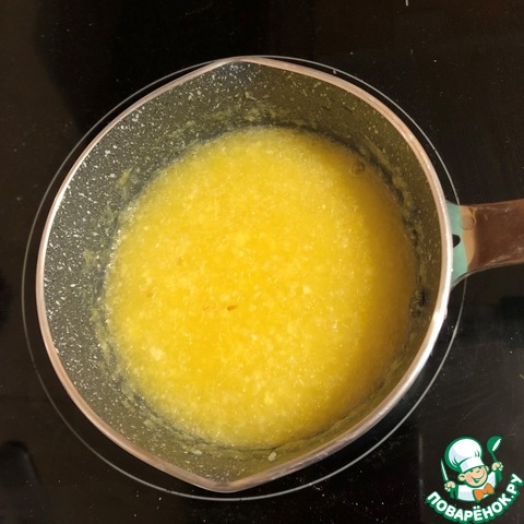 Добавляем воду (если у вас крупные фрукты или их просто больше - можно не добавлять). Если очень-очень кисло - немного подсластите, но в готовом десерте кислота уравновесится сладким сливочным слоем.