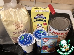 Смешиваем в кастрюльке сливки обоих видов и сахар. Постоянно помешивая, нагреваем до состояния "еще чуть-чуть - и горячо". Растворяем сахар, распускаем желатин. Остужаем при комнатной температуре до температуры тела, вмешиваем йогурт и заливаем в форму.