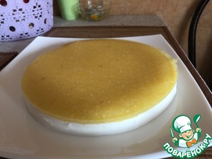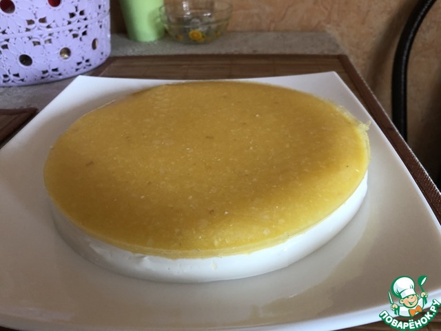 Подогреваем, помешивая, на маленьком огне до состояния "еще чуть-чуть - и горячо", распускаем желатин, остужаем до температуры тела и заливаем в форму. Отправляем в холодильник на полчаса-час. -